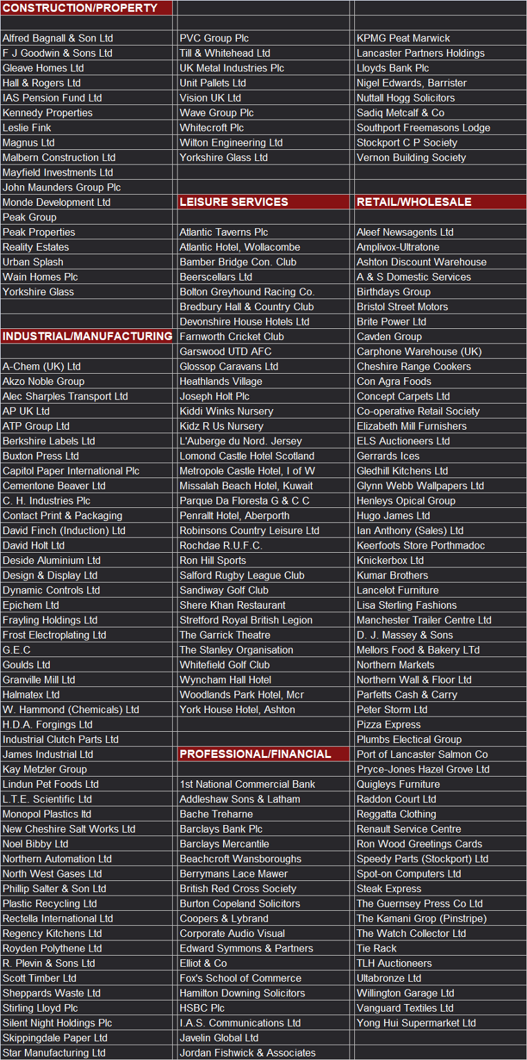 This Practice has a wealth of experience in sucessfully representing clients throughout Commerce and Industry. Among the numerous clients our staff have acted for:-